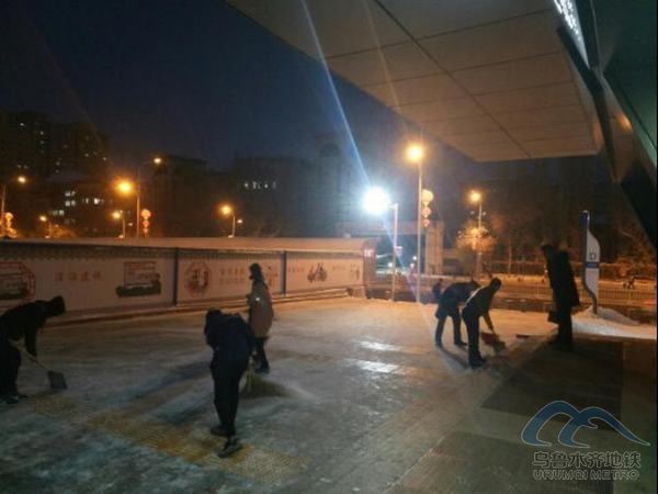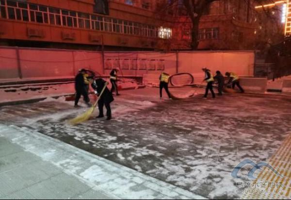各車站,為乘客營造良好的出行環(huán)境,避免乘客在出入口因地面濕滑造成滑倒摔傷,在保證車站正常生產(chǎn)的情況下,合理安排、克服困難,組織工作人員對車站各出入口處、站前廣場進(jìn)行清雪工作,并在車站出入口放置防滑提示牌,安排志愿者在出入口溫馨提示進(jìn)出站乘客:“小心地滑,注意腳下安全!”
